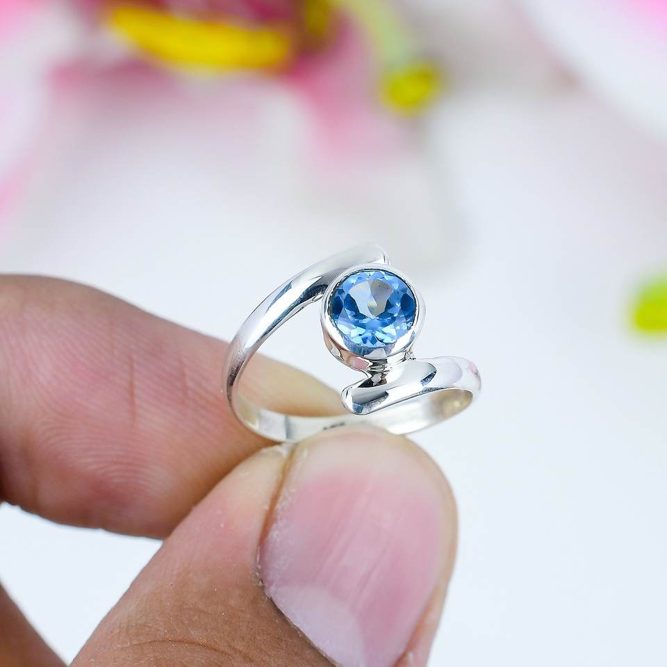 925 Sterling Silver Gold Plated Handmade Bezel Set Blue Topaz Gemstone Ring For Women & Unisex-Wedding Anniversary Engagement