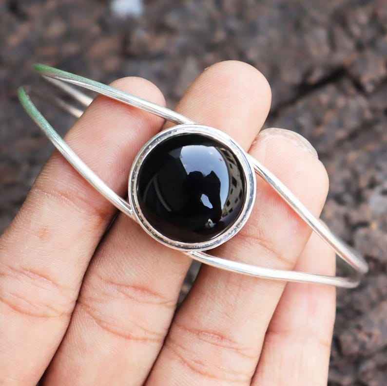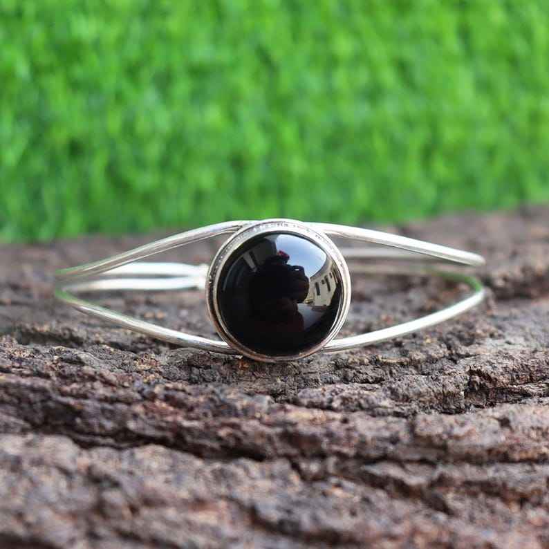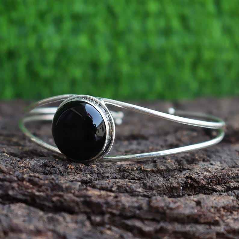 กำไลพลอยโอนิกซ์สีดำทำด้วยมือสีเงิน925ปรับได้
