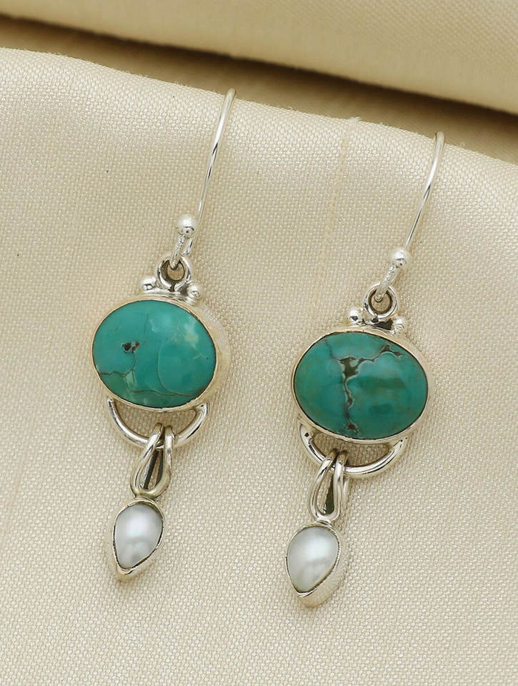 ต่างหูแบบห้อยแนววินเทจทำด้วยมือสีเงินสเตอร์ลิง925เทอร์ควอยซ์ขนาด10มม. ทรงพีระมิด5มม.
