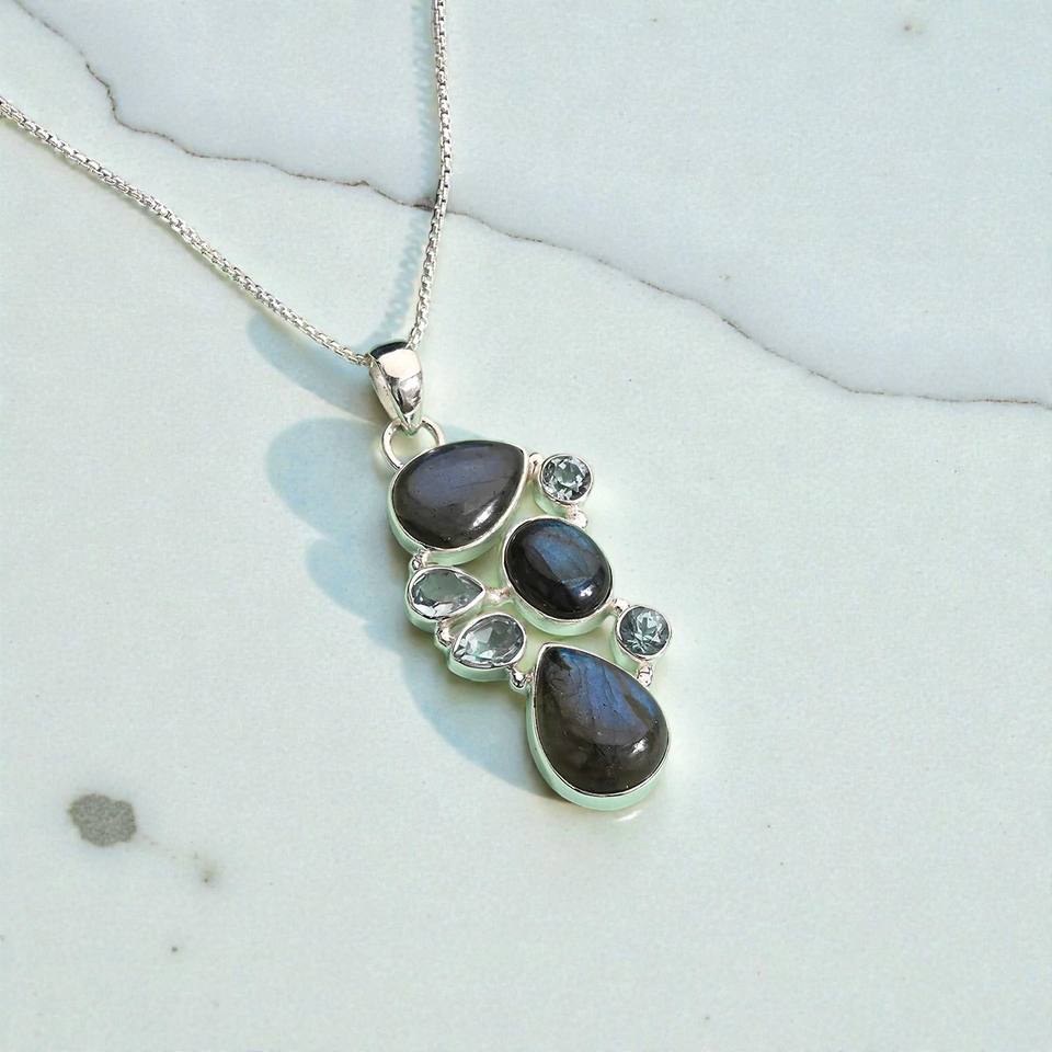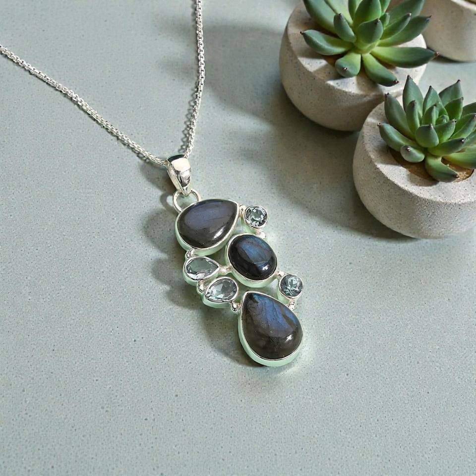 จี้หินลาบราดอไรต์ธรรมชาติและบลูโทแพซแบบหลายเม็ด ประดับเงินแท้ 925 ดีไซน์เฉพาะตัว ฝังแบบ Bezel
