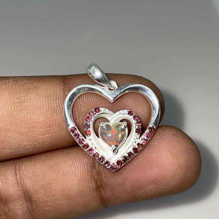 จี้โอปอลเอธิโอเปียนสีเงินสเตอร์ลิง925แบบหลายไฟจี้โอปอลโกเมนโอปอลธรรมชาติรูปหัวใจเพชรชุบด้วยเพชรอัญมณีวินเทจคริสเตียน