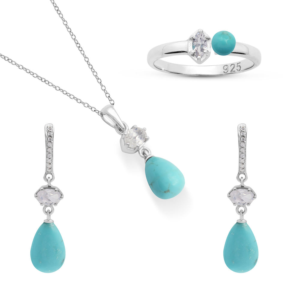 925สเตอร์ลิงเงินสีขาวบุษราคัมแบบง่ามและแขวนพลอยเทอร์ควอยซ์ชุดเครื่องประดับสร้อยคอต่างหูแหวนที่ละเอียดอ่อน