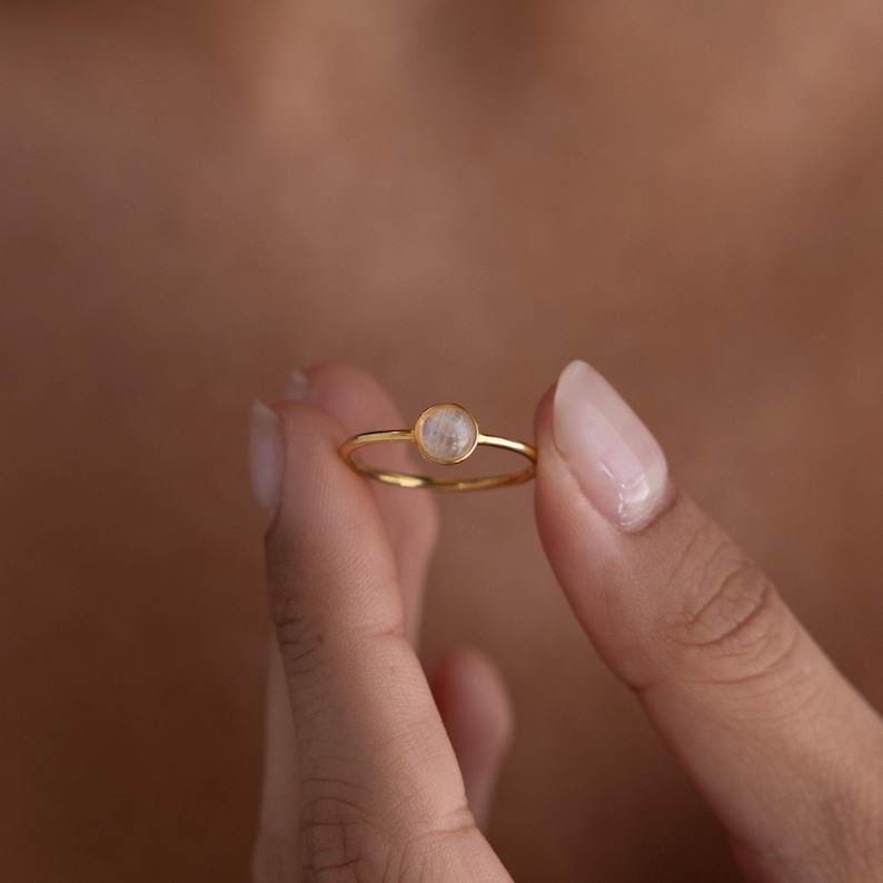 แหวนเพชรมูนสโตนสีรุ้งธรรมชาติชุบด้วยเงินสเตอริ925กรอบแบบมินิมอลเครื่องประดับแฟชั่นทำมือขนาด3มม. สำหรับผู้หญิง