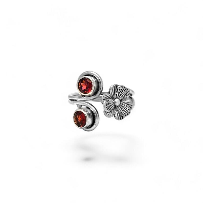 แหวนพลอยเพทายสีแดงเงินสเตอร์ลิง925ตัดเป็นออกซิไดซ์แบบทรงกลมโบฮีเมียนฮาร์ทแฮนด์เมดออกแบบมาอย่างดีเครื่องประดับสำหรับงานแต่งงานหินประจำเดือนแดน