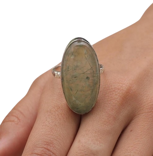 แหวนเงินแท้ 925 ชุบโรเดียม ประดับพลอยเพรนไนต์ทรงรี งานแฮนด์เมด ของขวัญงานแต่งงาน แหวนพลอยธรรมชาติ ดีไซน์ทันสมัย
