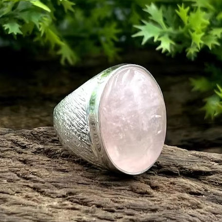 แหวนเงินเยอรมันชุบโรเดียมประดับโรสควอตซ์ งานแฮนด์เมด ดีไซน์ขอบแบบ Bezel แหวนแฟชั่นสำหรับทุกเพศ