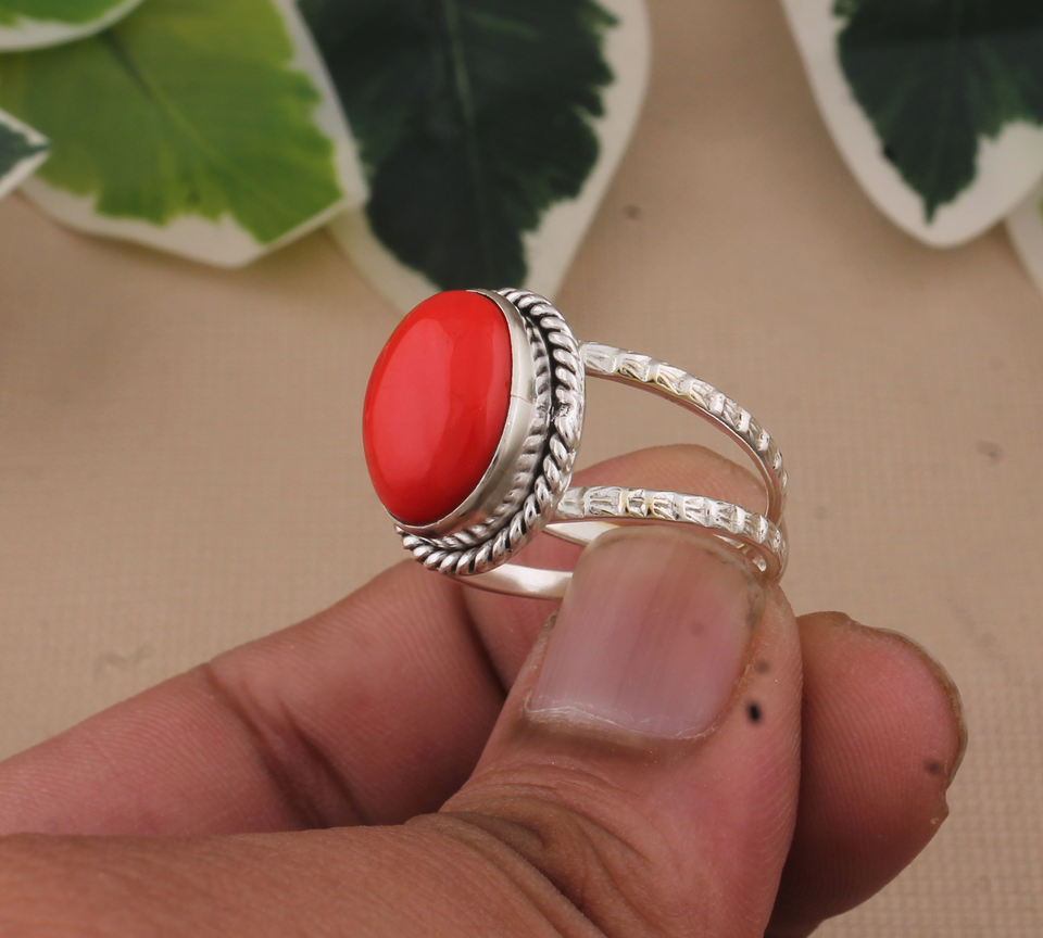 แหวนเงินสเตอร์ลิง925พร้อมปะการังแดงทรงไข่เครื่องประดับโบโฮทำด้วยมือแหวนโซลิแทร์ของขวัญสำหรับผู้หญิง