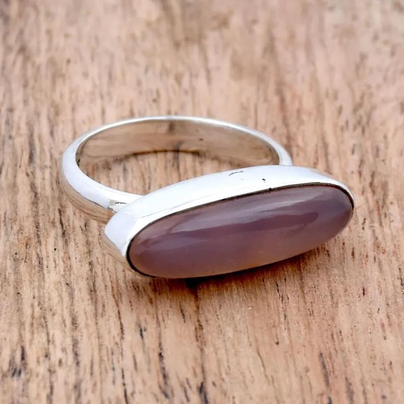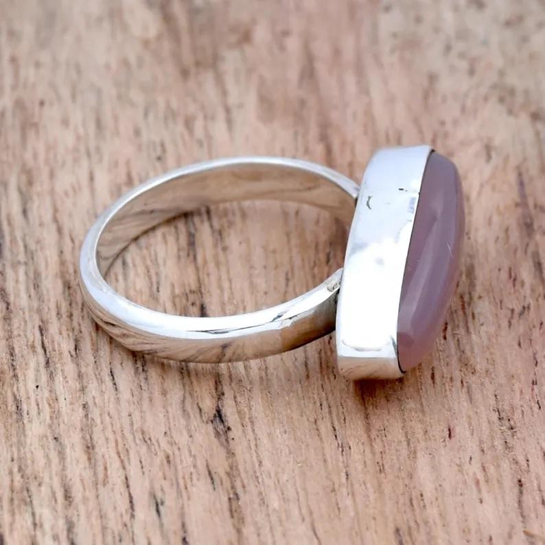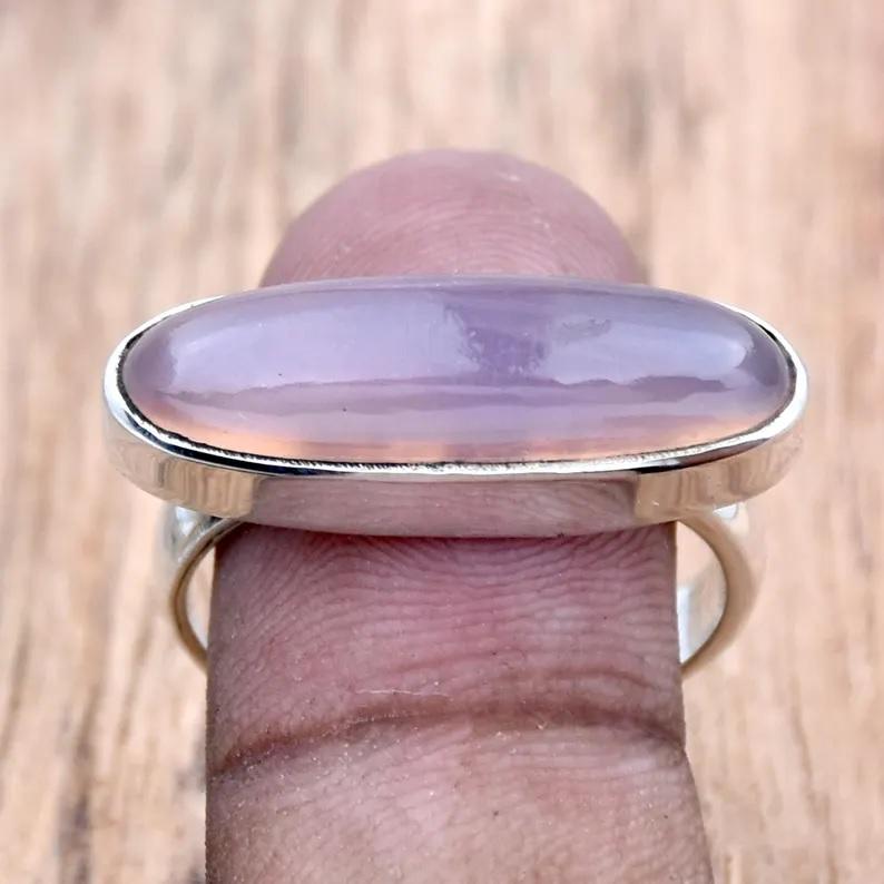 925แหวนเงินแท้สีโรสควอตซ์ทำด้วยมือเครื่องประดับอัญมณีรูปวงรีเป็นของขวัญสำหรับเธอ