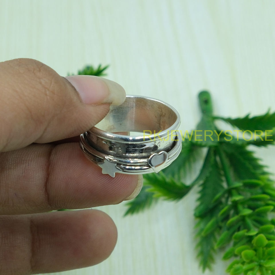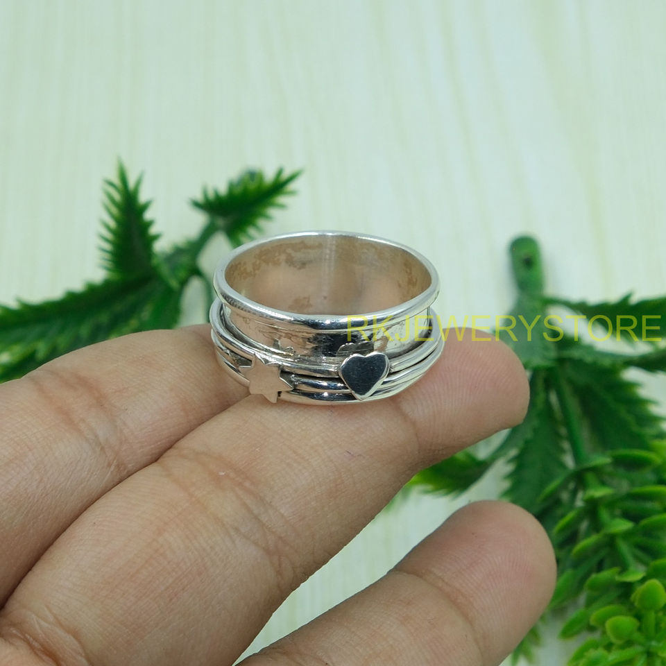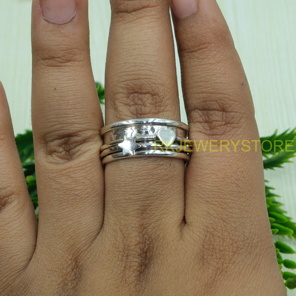 แหวนเงินแท้ 925 สำหรับผู้หญิงและผู้ชาย ดีไซน์รูปดาวและหัวใจ แหวนสำหรับทำสมาธิ แหวนเงินทำมือ เครื่องประดับสำหรับทุกเพศ