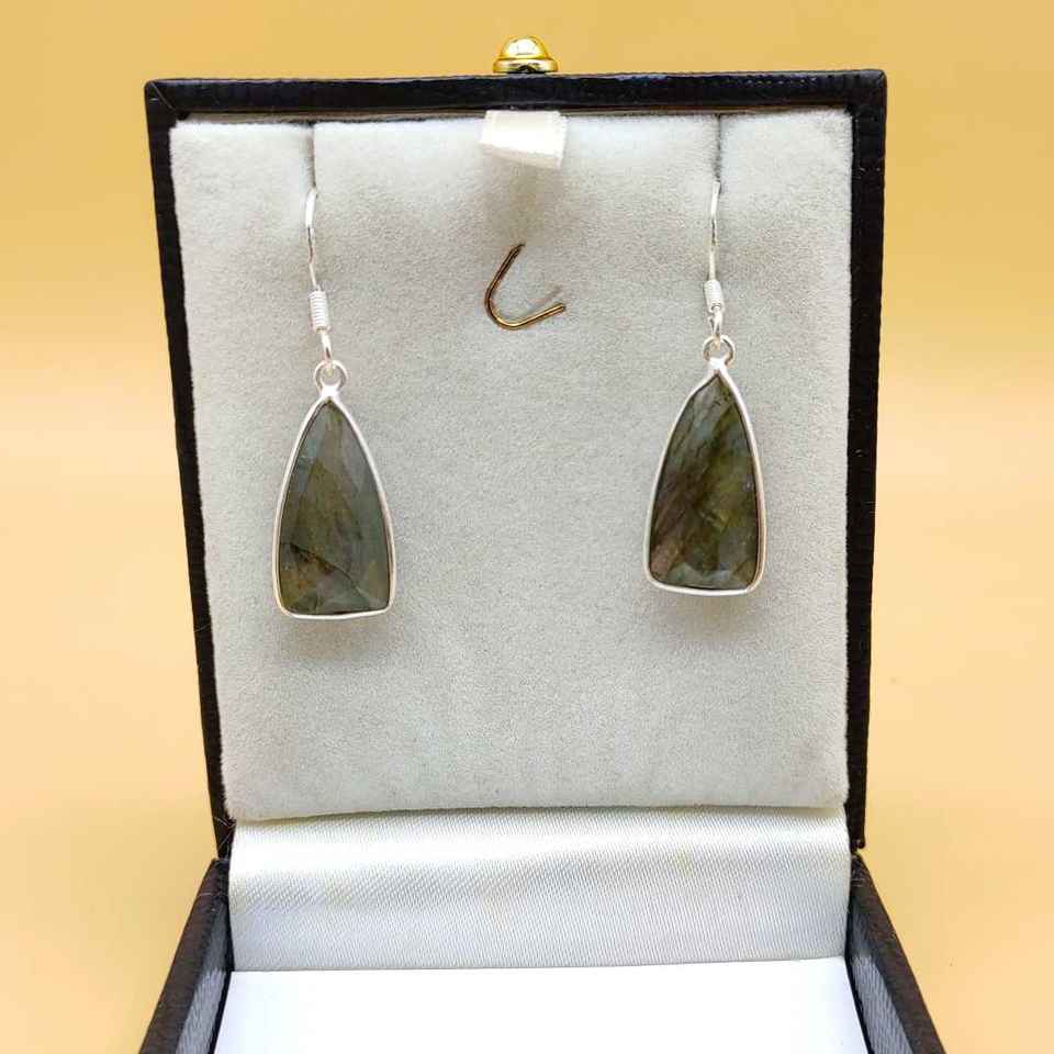 ต่างหูหยดน้ำสามเหลี่ยมเงินสเตอร์ลิงพร้อมพลอยลาบราดอไรต์แบบเหลี่ยมเพชรพลอยงานแฮนด์เมดของขวัญวันเกิดงานแต่งงานสำหรับเจ้าสาวใน925