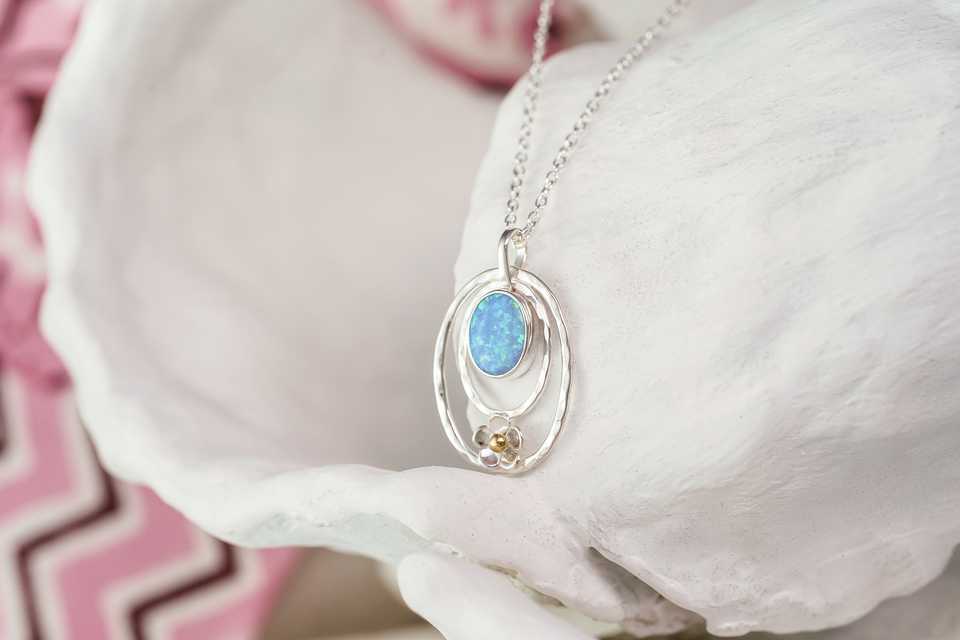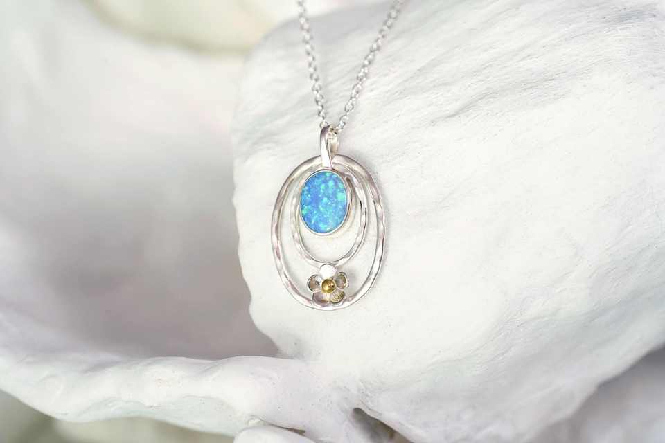สร้อยคอโอปอลสีเงินแท้925มีเอกลักษณ์และดอกไม้สีฟ้าสีเงินสเตอร์ลิงเครื่องประดับดอกไม้หินประจำเดือนเกิด