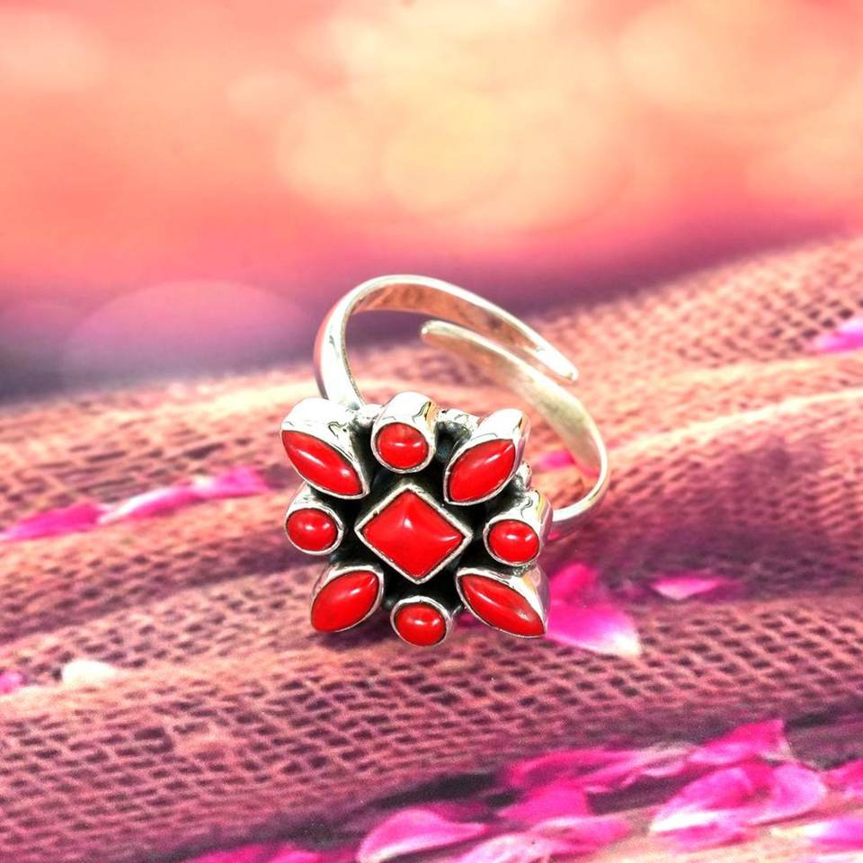 แหวนแต่งงานเงินแท้925ชิ้นทำด้วยมือปะการังธรรมชาติพร้อมอัญมณีหลายชิ้นตัดเป็นรูปทรงเพชรของขวัญที่สามารถปรับได้สำหรับ R0365-GS ของเธอ