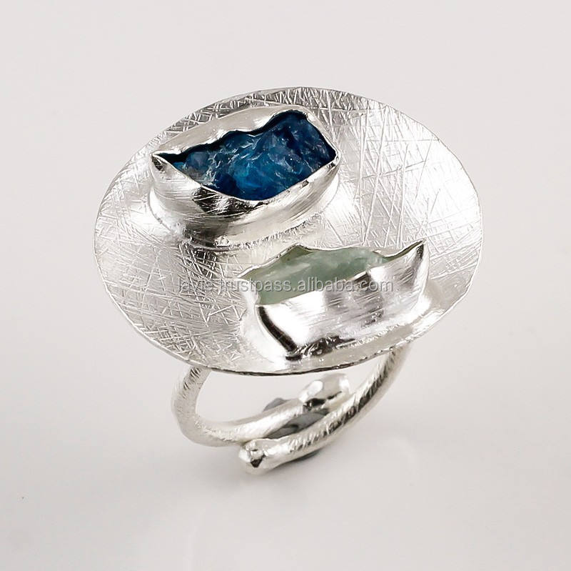 แหวนแต่งงานเงินสเตอริง925พร้อมพลอยอะพาไทต์สีฟ้าและนีออนหยาบแบบธรรมชาติผู้ส่งออกเครื่องประดับขายส่ง