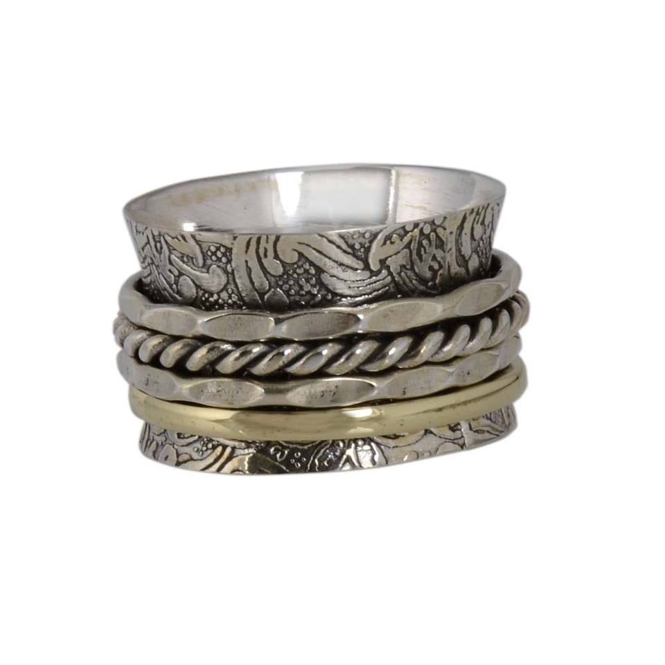 แหวนเงินสเตอร์ลิงวงกว้าง925แหวนสปินเนอร์ทำด้วยมือพร้อมสายเงินสองเส้นการตั้งค่าหนามเตยสำหรับงานปาร์ตี้
