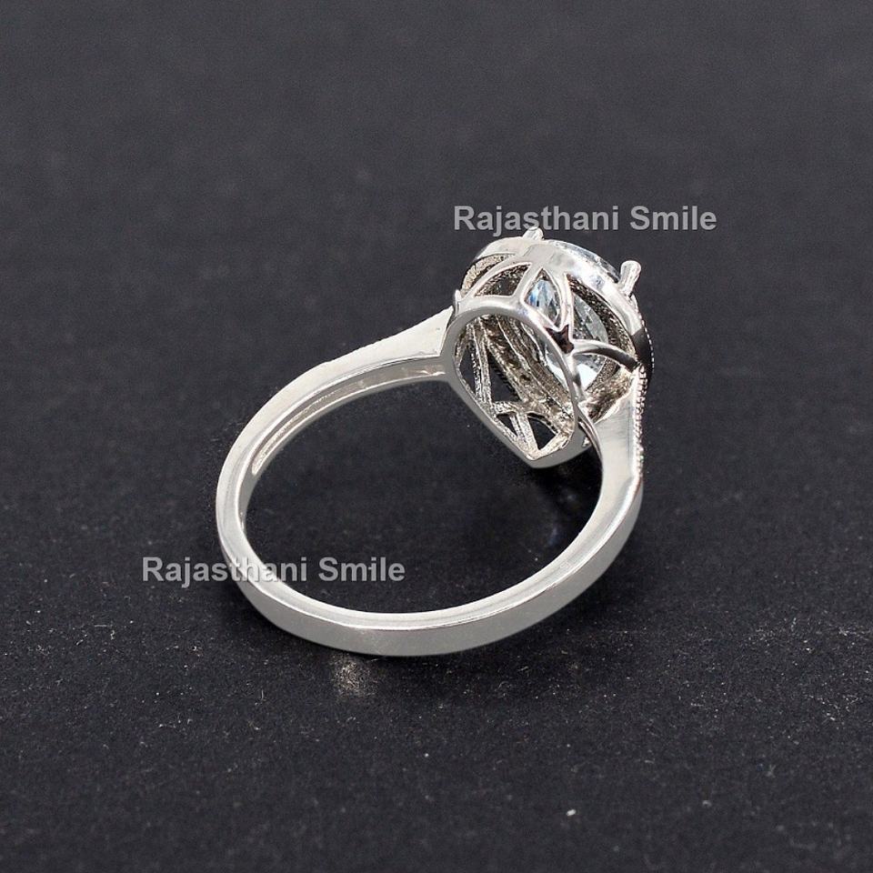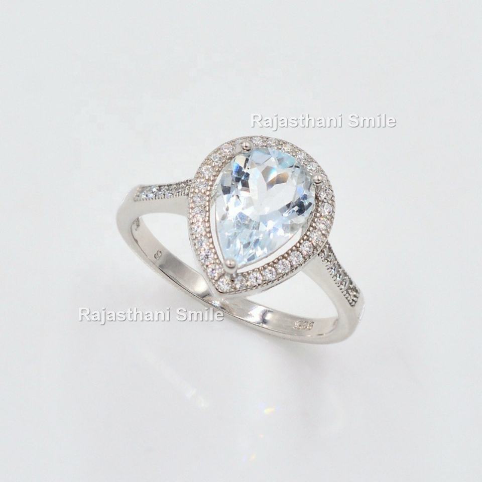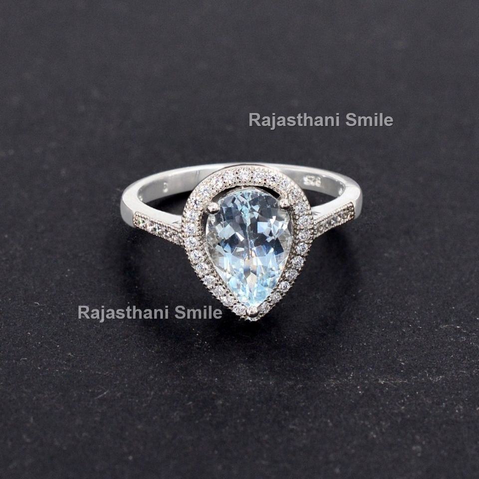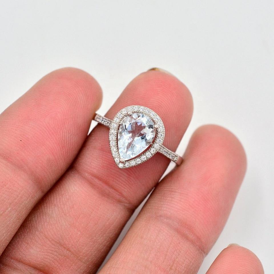 แหวนเงินแท้ 925 สำหรับผู้หญิง แหวนหมั้น แหวนแต่งงาน พลอยอะความารีนธรรมชาติทรงบริลเลียนต์ 10x7 มม. ประดับเพชร CZ ชุบโรเดียมทรงรัศมี