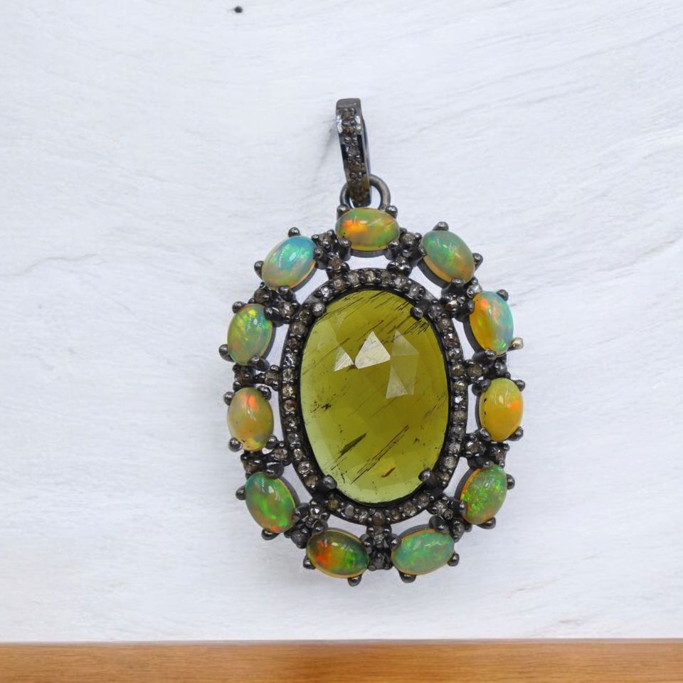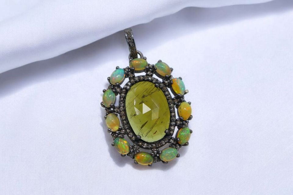 จี้เพชรเงินแท้ 925 ประดับพลอยทัวร์มาลีนสีเหลืองทรงสไลซ์เจียระไน จี้โอปอลเอธิโอเปีย จี้เพชร