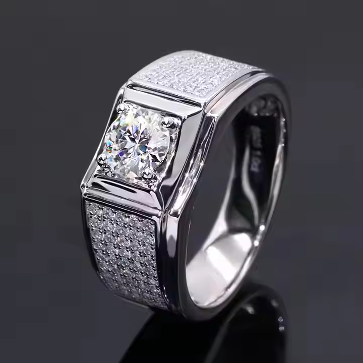แหวนเพชรมออิสซาไนต์สำหรับผู้ชายชุบเงิน925พร้อมหินเจียระไนทรงกลมและออกแบบมาเพื่อความสง่างามในชีวิตประจำวันสไตล์กล้าหาญ