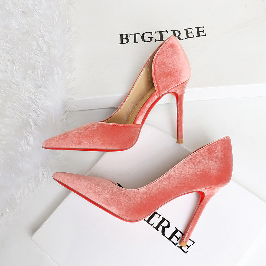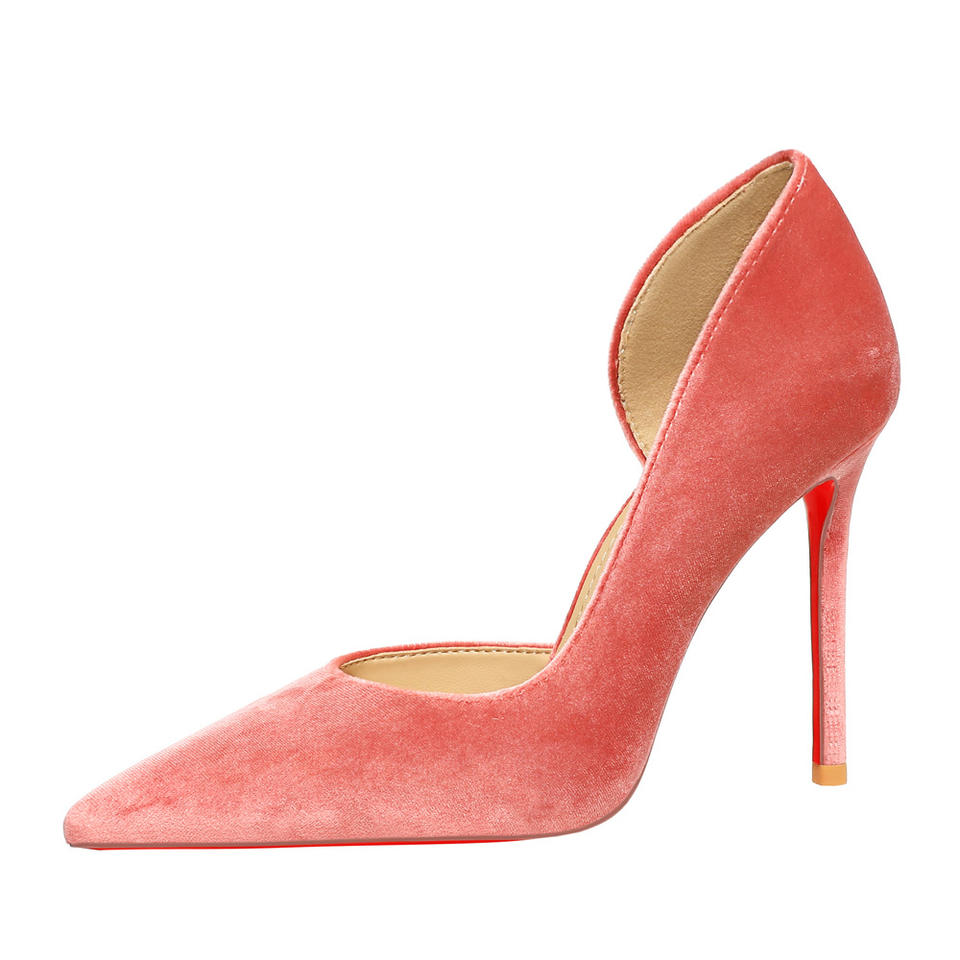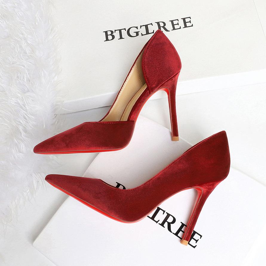 รองเท้าส้นสูงทรงสลิปออนแบบมีสายรัดข้างสีแดงสไตล์ยุโรปอเมริกัน รุ่น 9269 ทำจากกำมะหยี่ พื้นยาง ช่วยให้เท้าดูเรียวเล็ก ปลายแหลม สำหรับผู้หญิง