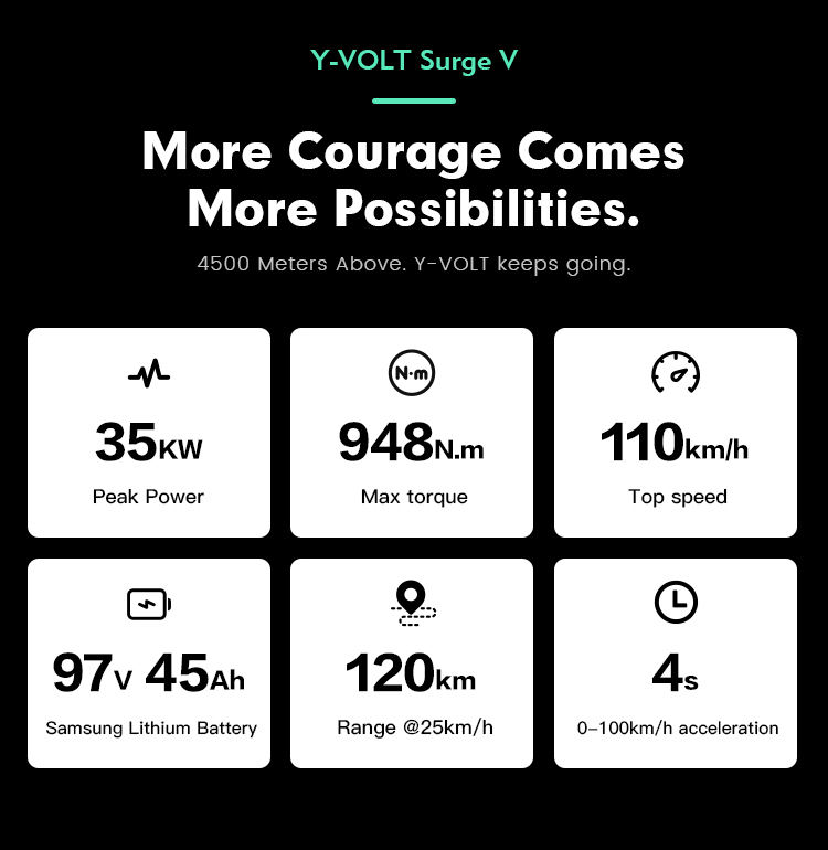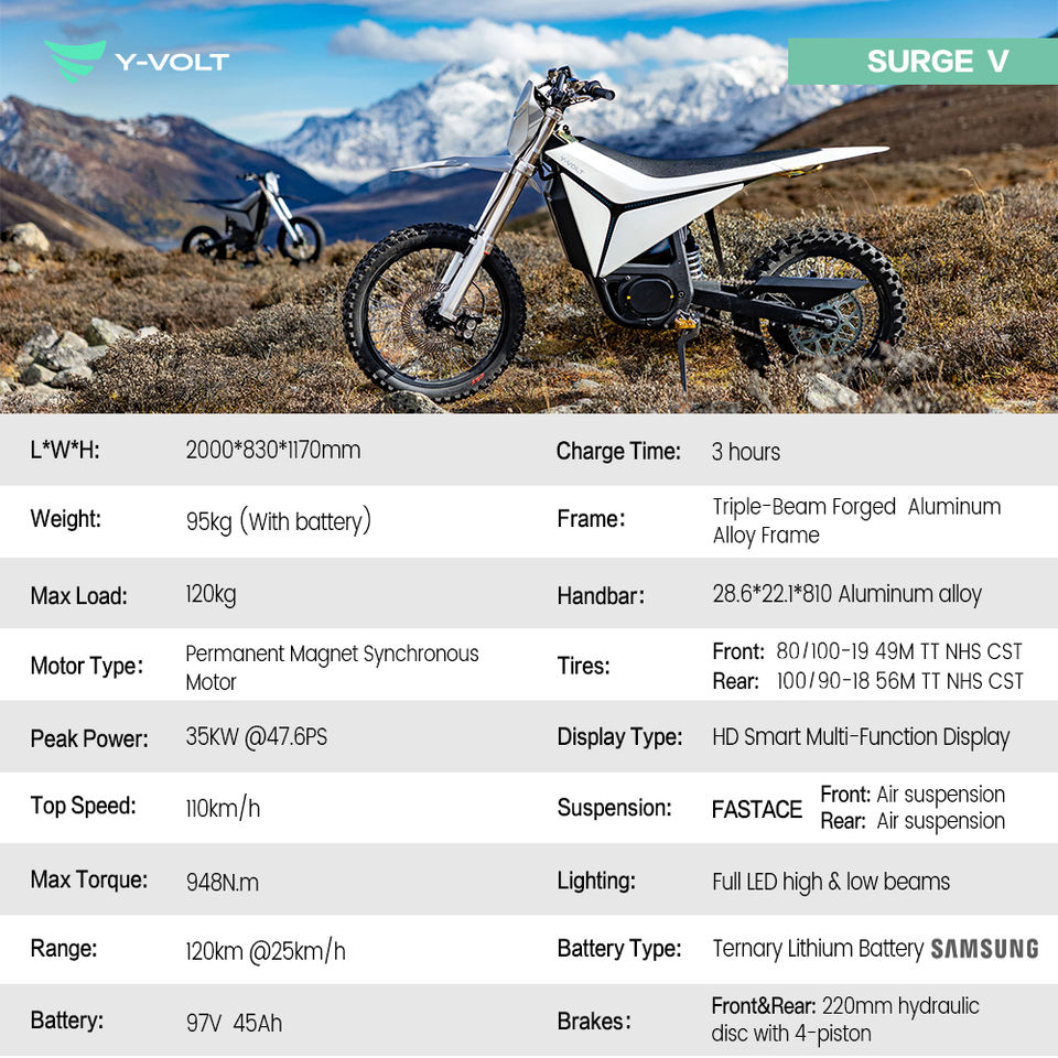 แรงบิด 948 นิวตันเมตร กำลังไฟ 35 กิโลวัตต์ ความเร็วสูงสุด 110 กิโลเมตรต่อชั่วโมง รถจักรยานยนต์ไฟฟ้าออฟโรด Y-Volt Surge V ขับเคลื่อนด้วยแบตเตอรี่ลิเธียม 97.2 โวลต์ 45 แอมป์ชั่วโมง