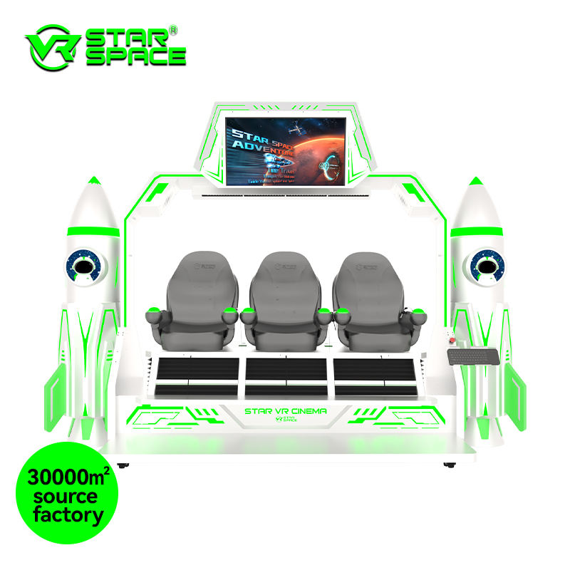 เครื่องจำลองเกมอาร์เคด 9D VR 3 ที่นั่ง เครื่องเล่นเกมโรงภาพยนตร์ 4D ที่น่าสนใจ สำหรับใช้งานในร่มและกลางแจ้ง วัสดุโลหะ