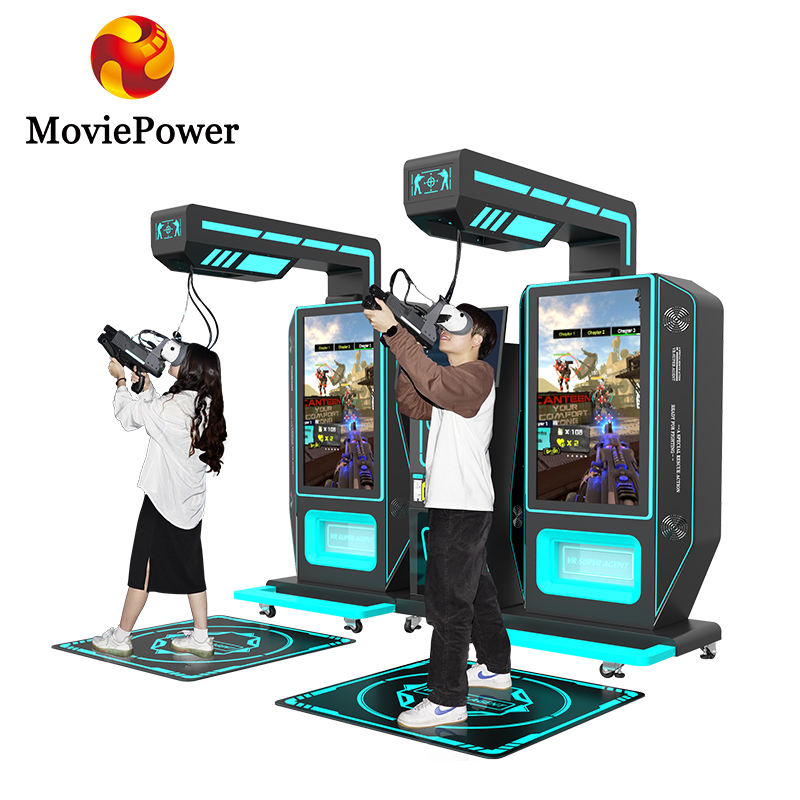 เครื่องเล่นเกมยิงปืนเสมือนจริง 9D VR สำหรับสวนสนุกในร่ม สนามบิน และการศึกษา รองรับผู้เล่น 2 คน ทำจากโลหะ หมุนได้ 360 องศา