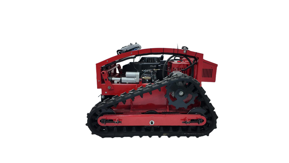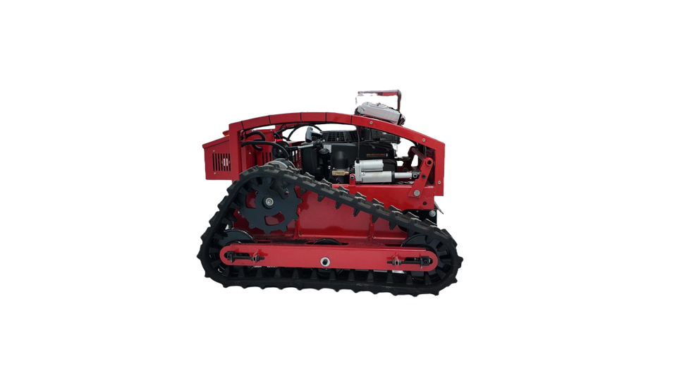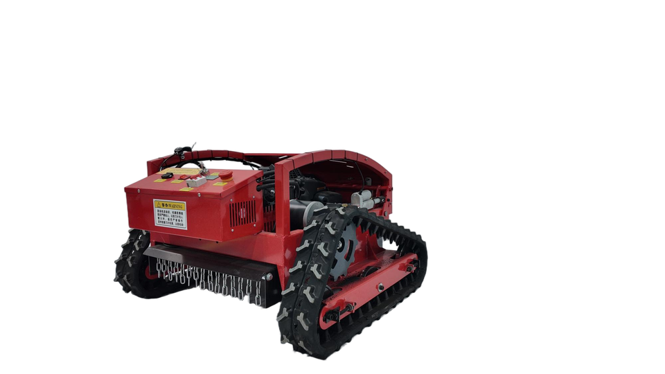 เครื่องตัดหญ้าแบบสายพานตีนตะขาบ 9 แรงม้า ใช้เชื้อเพลิงเบนซิน ควบคุมด้วยรีโมท สำหรับตัดหญ้าในสวนผลไม้และพื้นที่ลาดชัน