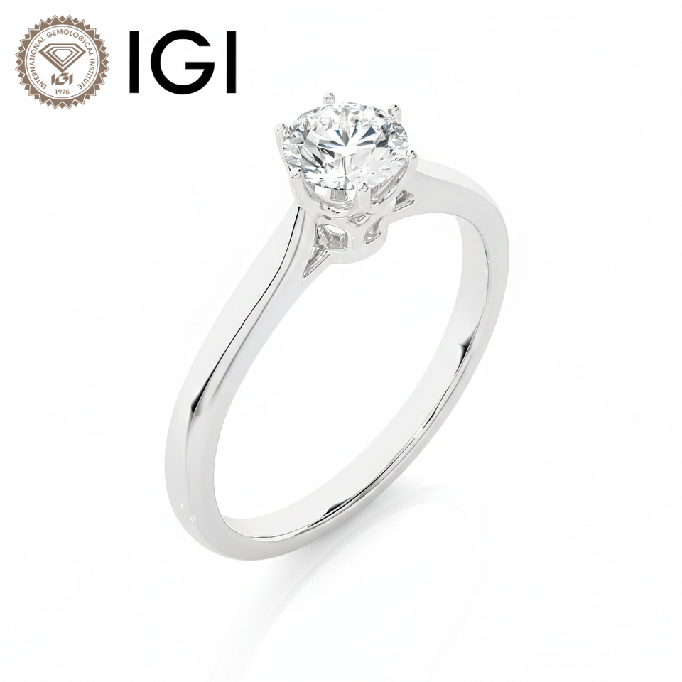 แหวนเพชรทรงกลมเจียระไนแบบบริลเลียนท์ น้ำหนัก 1-5 กะรัต สี E ความสะอาด VS1 ได้รับการรับรองจาก IGI ผลิตจากทองคำขาว 9K ตัวเรือนแบบหนามเตย สำหรับผู้หญิง