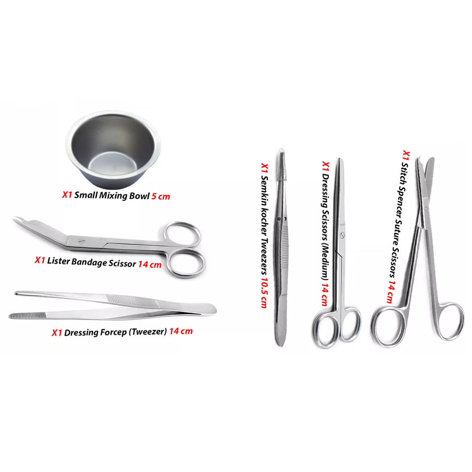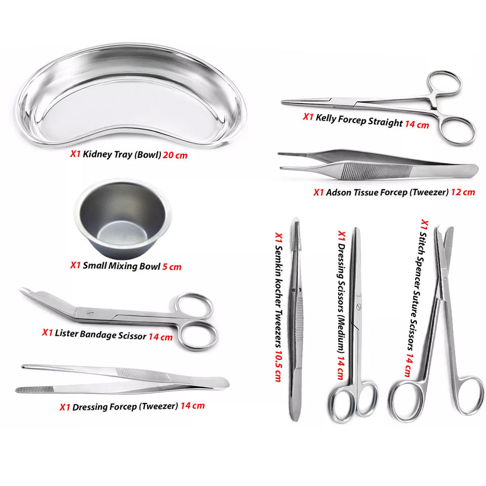 ชุดเครื่องมือผ่าตัด 9 ชิ้น ทำจากสแตนเลส ประกอบด้วย กรรไกร, คีม, แกลลิพอต และถาดไต สำหรับการดูแลบาดแผลและการเย็บแผล ยี่ห้อ Narham