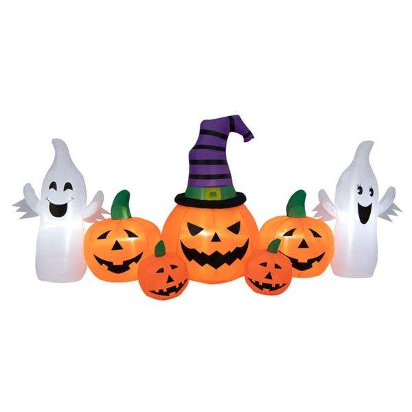 ของตกแต่งสวนกลางแจ้งแบบเป่าลมสำหรับวันฮาโลวีน ขนาด 9 ฟุต ทำจากโพลีเอสเตอร์กันน้ำ รูปฟักทอง 5 ลูก ผี 2 ตัว พร้อมไฟ LED ภายใน 1 ชุด พร้อมปั๊มลม 1 ตัว