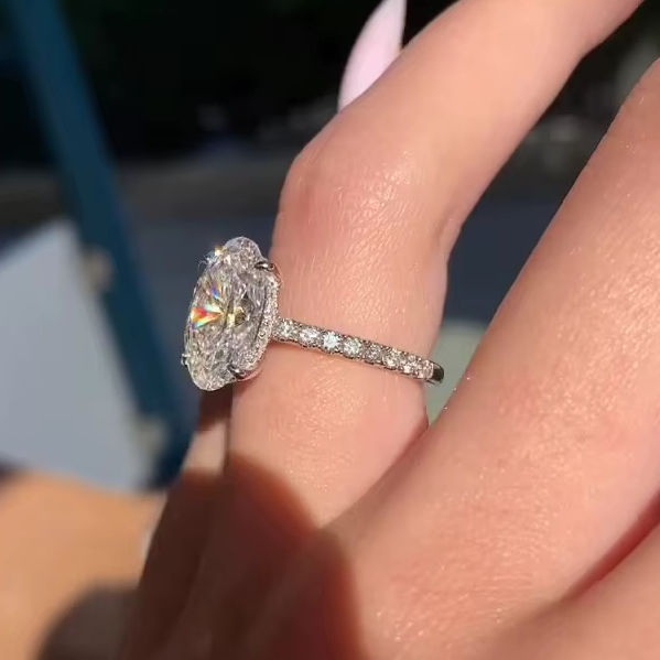 แหวนเพชรโมอิสที่ซ่อนอยู่ในวงรีขนาด9X11มม. แหวนหมั้นวงแหวนปูทองขาวชุบ925เครื่องประดับเงินขายส่ง