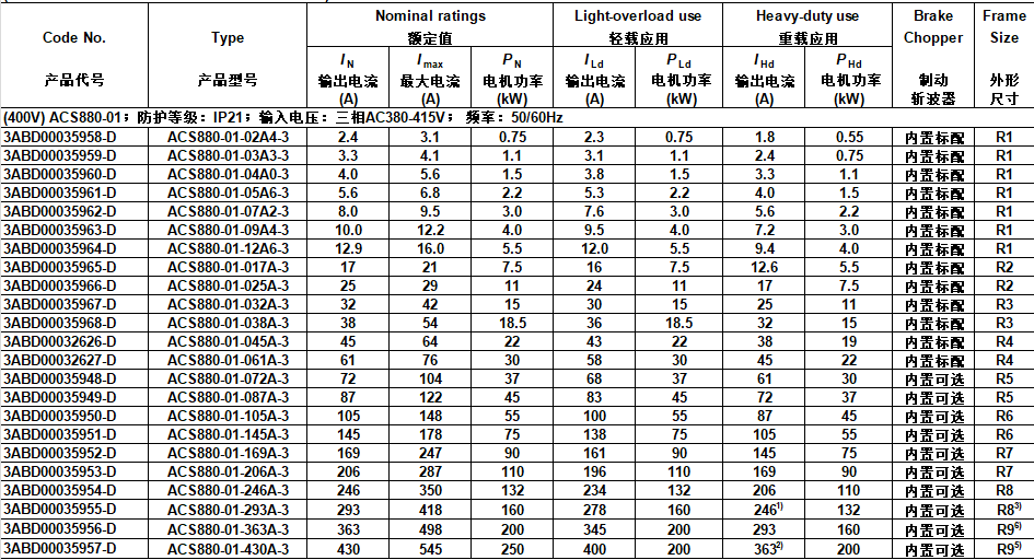 A-BB ACS880ไดรฟ์3เฟส AC ซีรีส์380V-415V หรือ380V-500V 5.5KW/20KW หรือ1.1KW/15KW 50/60Hz ไฟฟ้ากระแสสลับ3เฟส