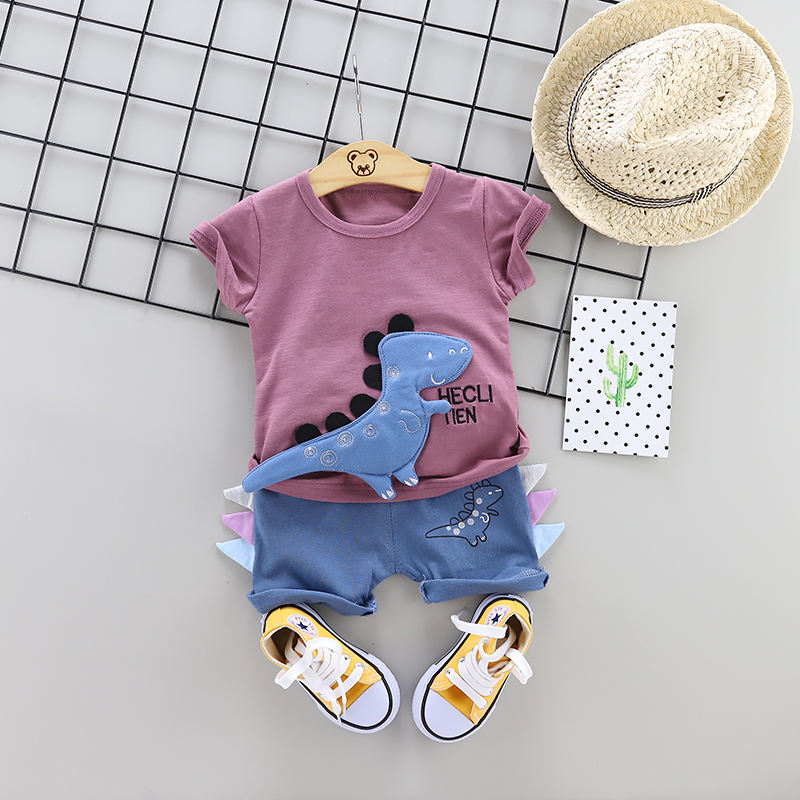 เด็กชายในสภาพอากาศร้อนสวมชุดเสื้อสเวตเชิ้ตพร้อมเสื้อยืดลายไดโนเสาร์ ชุดเสื้อผ้าเด็กผู้ชาย ชุดเสื้อผ้าเด็กทารกครบชุด