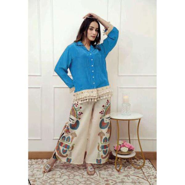 ตัดด้านบนด้วยปุ่มที่สวยงามและลูกไม้ทำงานบนขอบด้านบนด้วยตัวแบ่งความคมชัดกับการพิมพ์ดิจิตอลที่สวยงาม