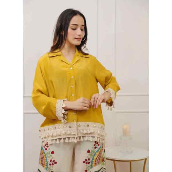 ตัดด้านบนด้วยปุ่มที่สวยงามและลูกไม้ทำงานบนขอบด้านบนด้วยตัวแบ่งความคมชัดกับการพิมพ์ดิจิตอลที่สวยงาม
