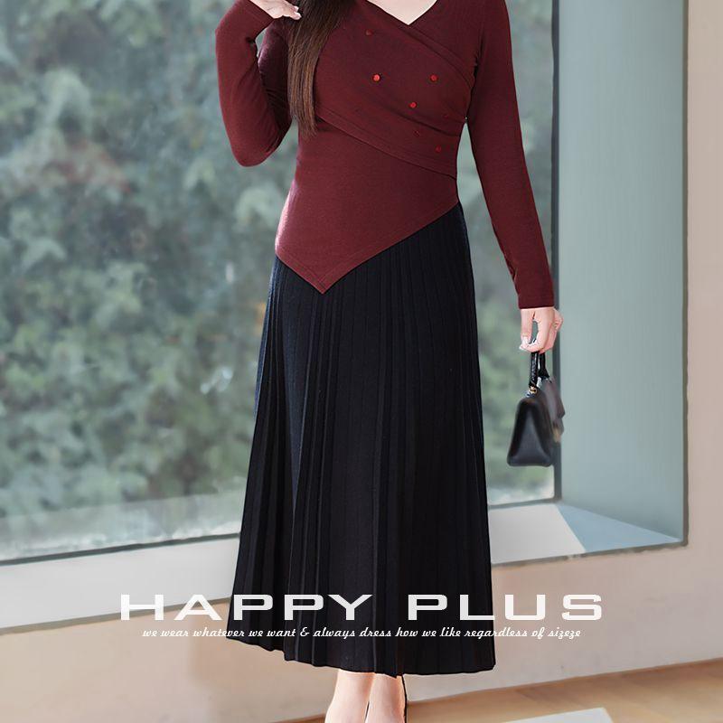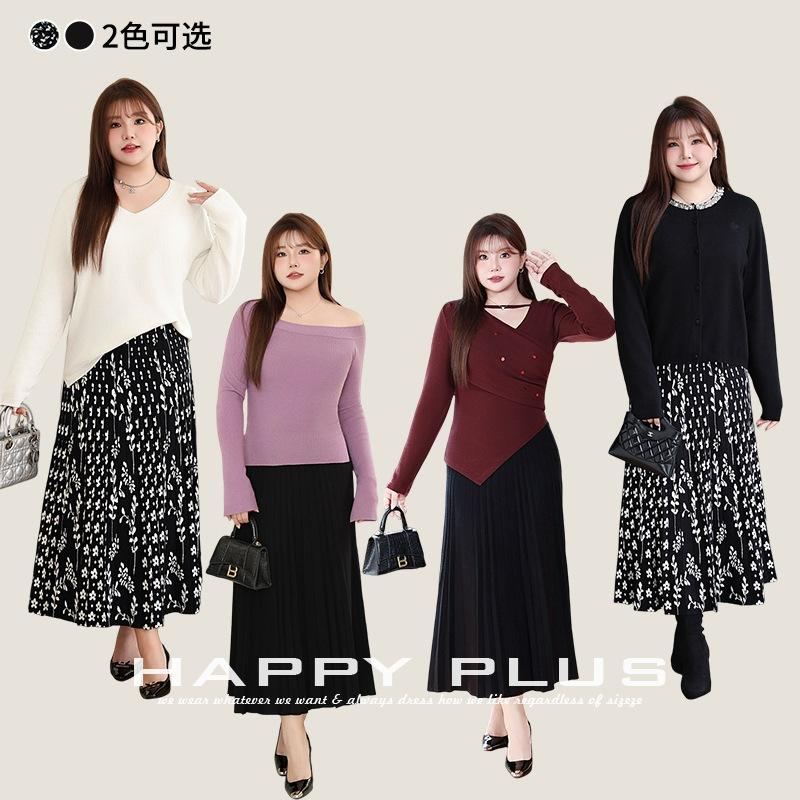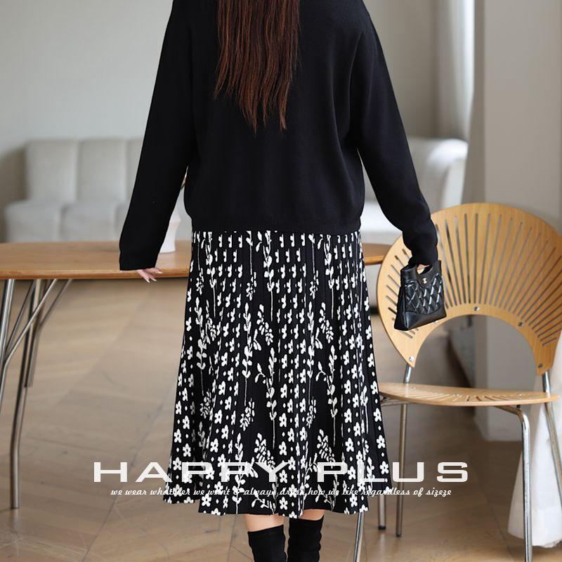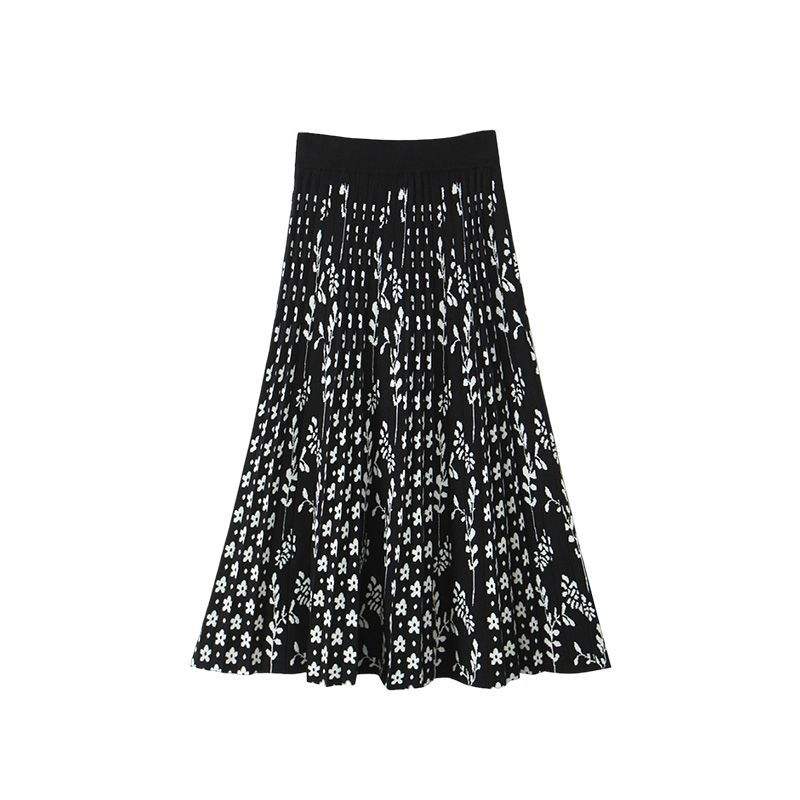 กระโปรงมิดิทรงเอไลน์เอวสูงผ้าถักพิมพ์ลายดอกไม้สีดำสำหรับผู้หญิงไซส์พลัส รุ่น N9030
