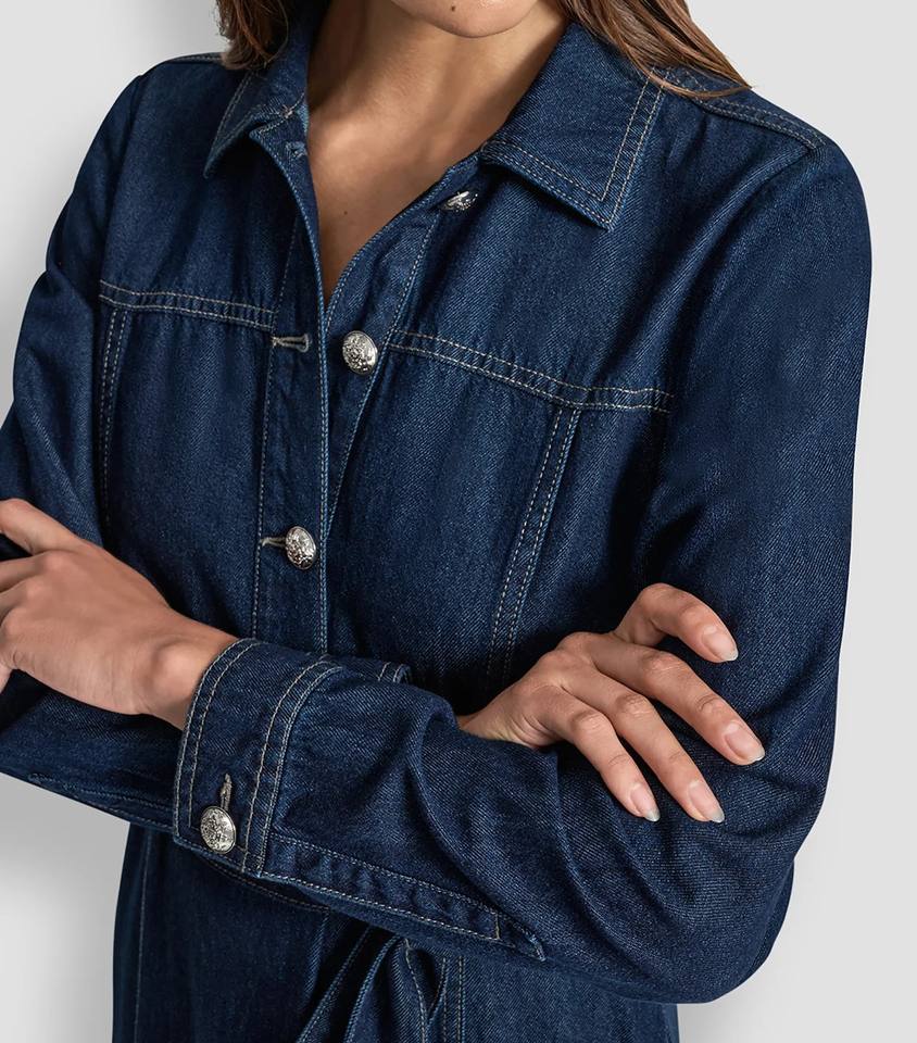 เดรสยีนส์ทรงเอ แขนยาว คอตั้ง ผ่าข้าง ซับในผ้าฝ้าย ใส่สบายๆ สำหรับใส่เที่ยวเล่น ใส่ได้ทุกวัน ฤดูใบไม้ผลิ ฤดูใบไม้ร่วง แบบผูกคอ
