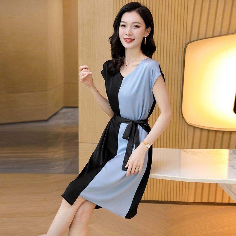 ใหม่เอวสูงยาวชุดยุโรปย้อนยุคกับบล็อกสีที่ไม่สม่ำเสมอ