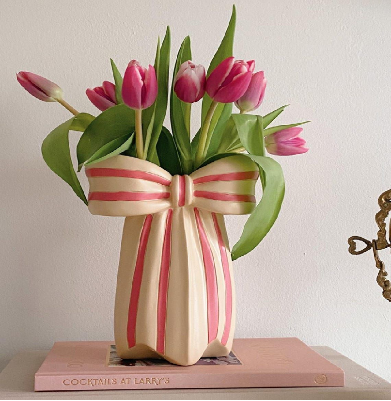 A classic white vase with a swirled texture and flared, ruffled rim. It's adorned with a detailed three-dimensional rose, leaf