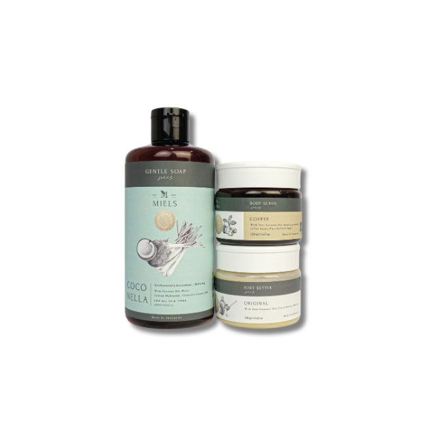 บอดี้บัตเตอร์สูตรออริจินัล 5 ชิ้น น้ำยาสบู่โคโคเนลล่า และสครับกาแฟสำหรับผิวหน้าและผิวกาย เพื่อผิวที่อ่อนเยาว์และเปล่งประกาย
