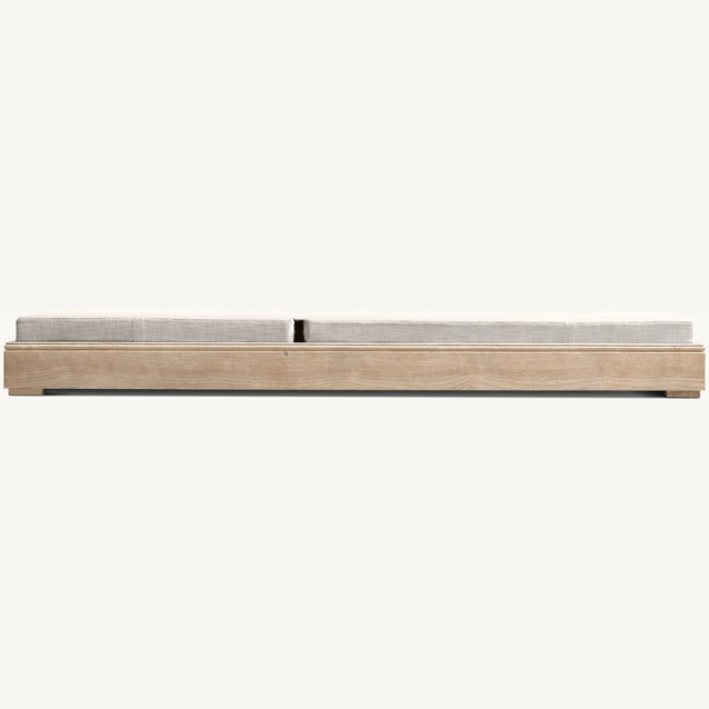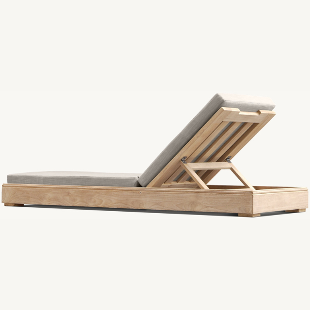 A sun lounger perfect for relaxing made of teak wood with a modern style for use on the beach or poolside