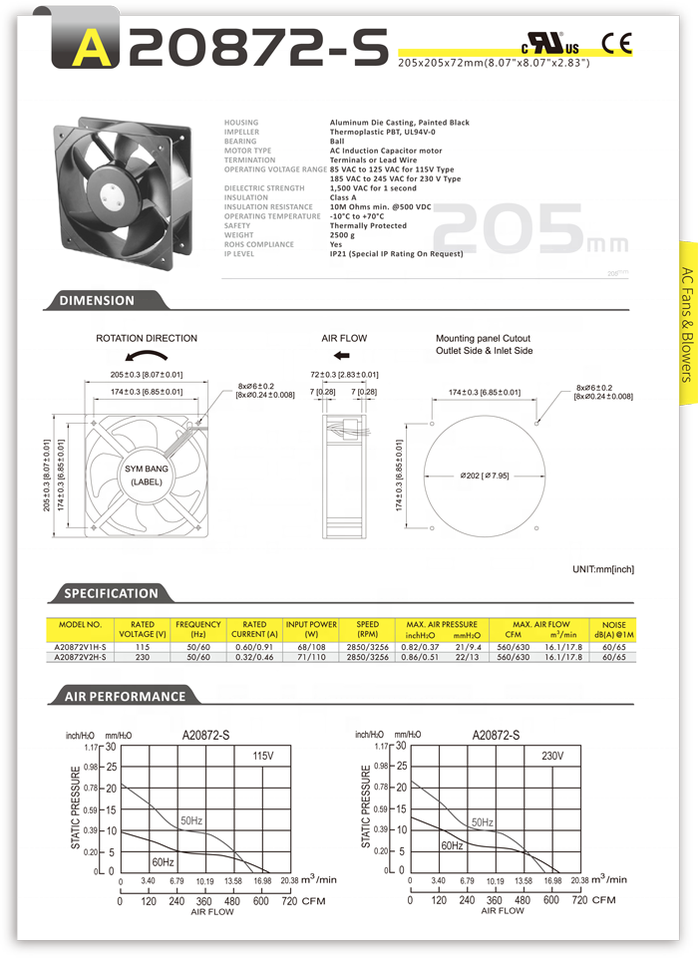 พัดลมระบายความร้อนแบบแกน A20872-S 115V 230V 208*72 มม.