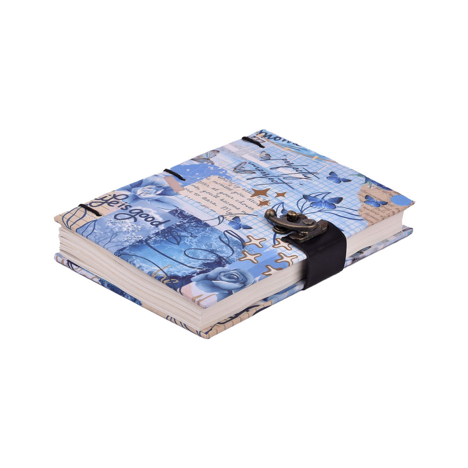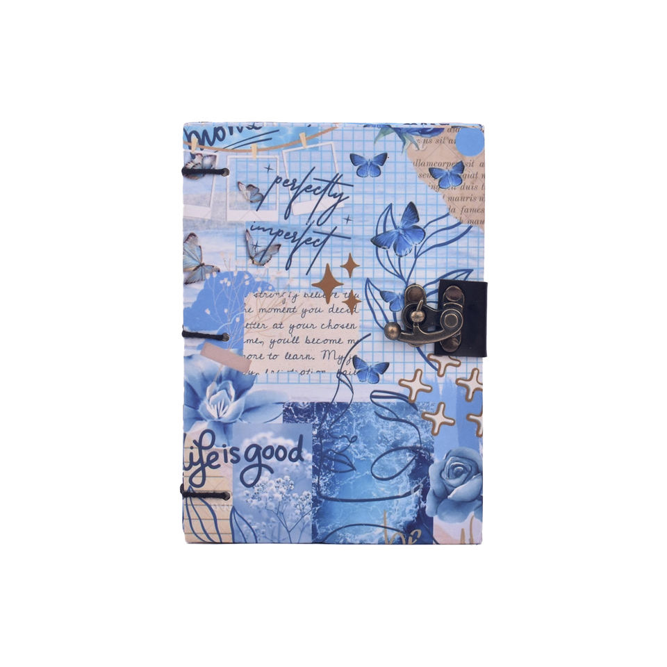 สมุดบันทึกทำมือ ดีไซน์คอลลาจสีฟ้า A5 พร้อมกุญแจล็อค 100 หน้า เขียนได้สองด้าน เป็นมิตรกับสิ่งแวดล้อม คุณภาพพรีเมียม