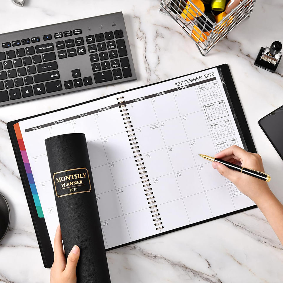 สมุดออร์แกไนเซอร์/แพลนเนอร์ A5 ปกหนังเย็บแบบสันเกลียว ปั๊มฟอยล์ทอง โลโก้แบบรักษ์โลก ปกแข็ง สายรัดยางยืด ดีไซน์สั่งทำได้ พิมพ์ลายได้
