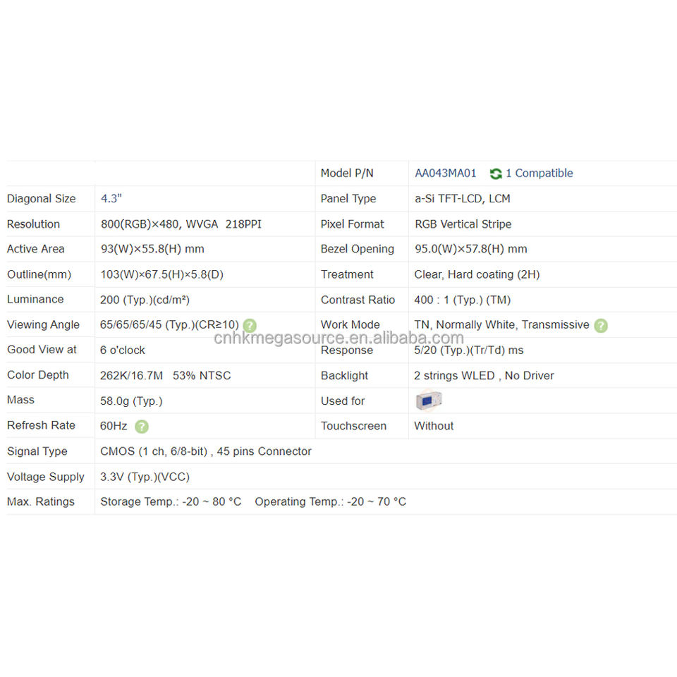 จอแสดงผล LCD เกรดอุตสาหกรรมขนาด4.3นิ้ว AA043MA01-หน้าจอแบบฝังที่มีความคมชัดสูงสำหรับอุปกรณ์พกพา/แผงควบคุมทางอุตสาหกรรม