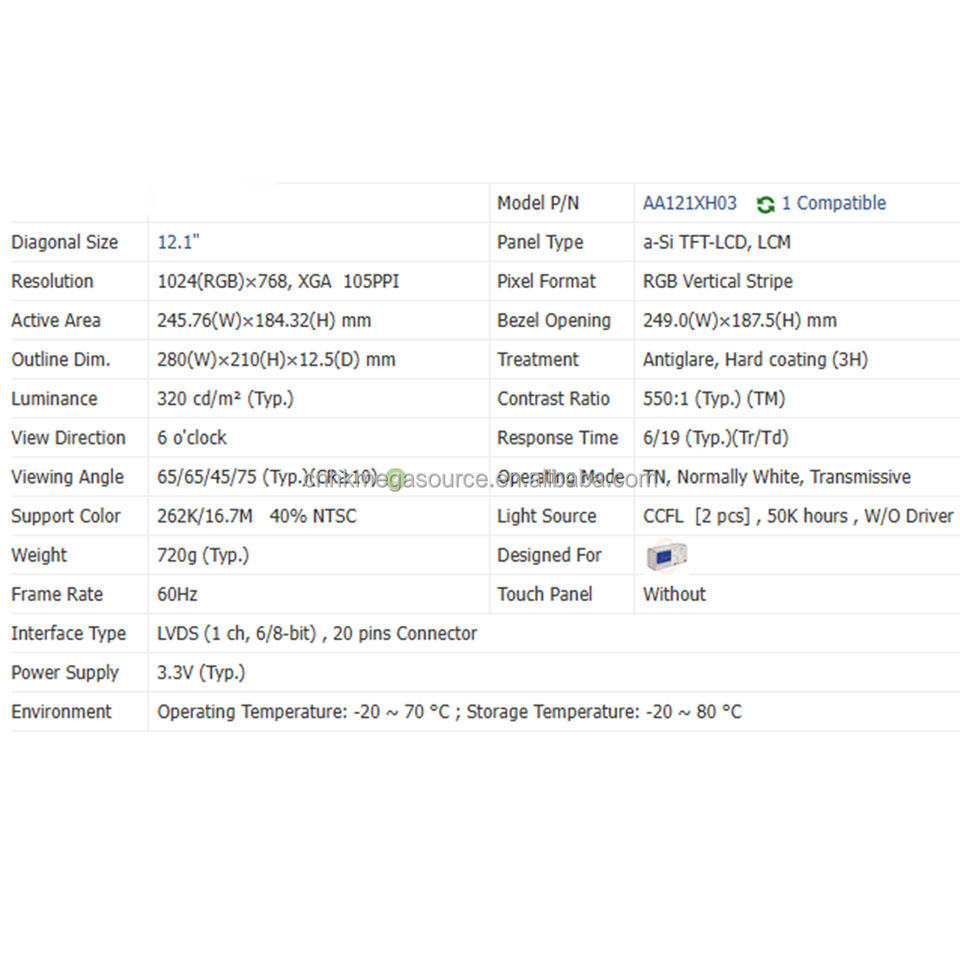 AA121XH03 Original 12.1 inch 1024*768 Industrial grade monitors lcd panel
