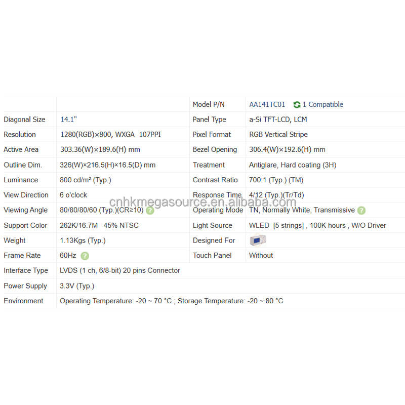 AA141TC01 14.1นิ้ว1280*800 TFT โมดูลหน้าจอ LCD จอแสดงผล LCD แผงจอ TFT LCD ในสต็อก