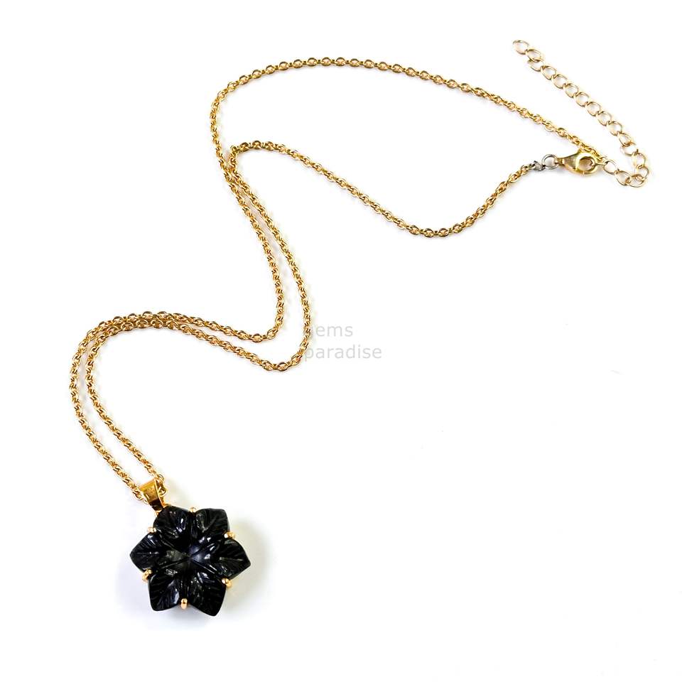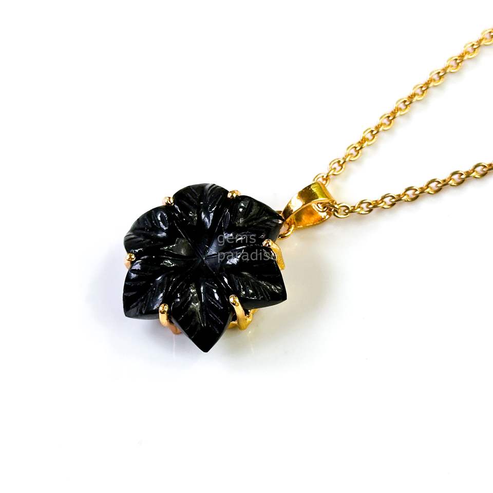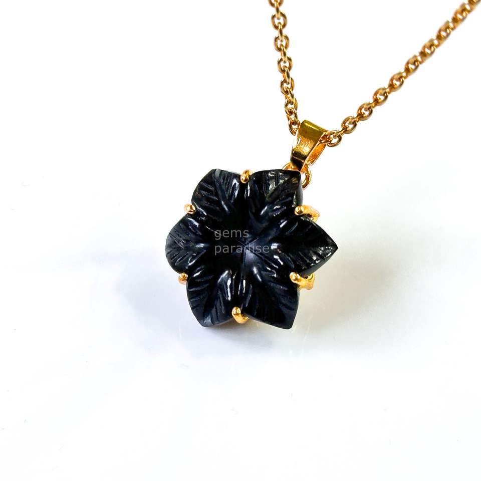 จี้รูปดอกไม้แบล็คออนิกซ์ AAA สร้อยคอคริสตัลรูปดอกไม้สำหรับผู้หญิง จี้พลอยแบล็คออนิกซ์แกะสลักด้วยมือ เครื่องประดับทำมือ