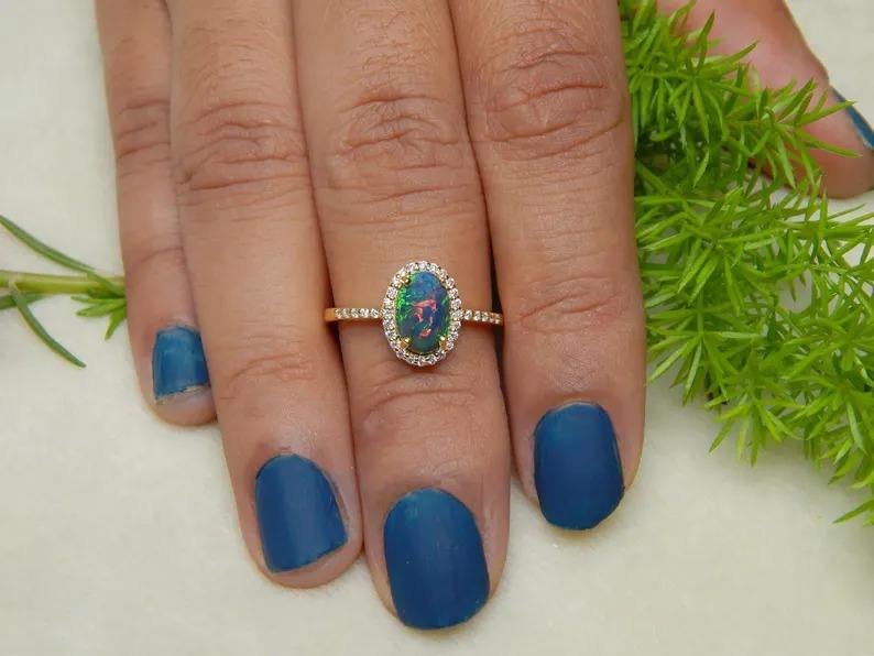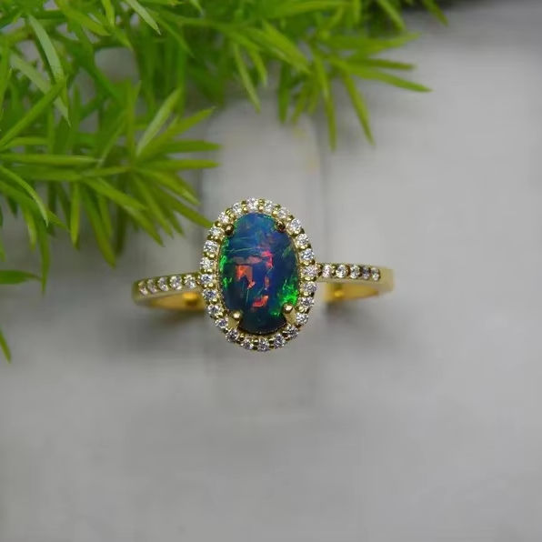 AA แหวนโอปอลสีดำ925เงินสเตอร์ลิงชุบทองวินเทจประดับด้วยง่ามอัญมณีชั้นดีจากธรรมชาติยิงได้หลายลูก