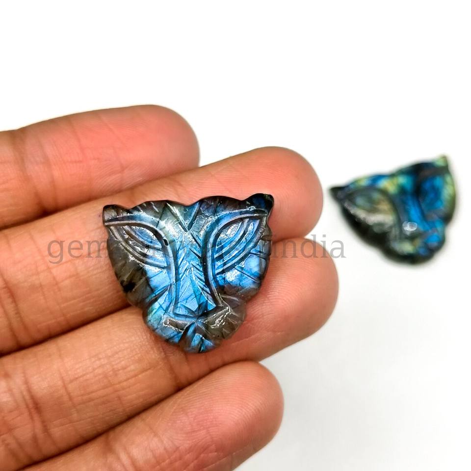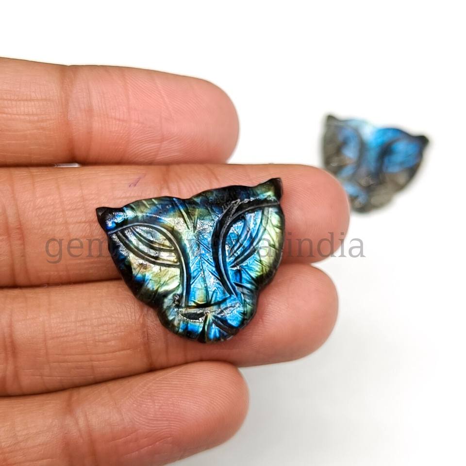 ผลิตภัณฑ์ป้ายชื่อลูกปัด:หินหลังเบี้ยแกะสลักใบหน้าสิงโตลาบราดอไรต์ฉูดฉาด