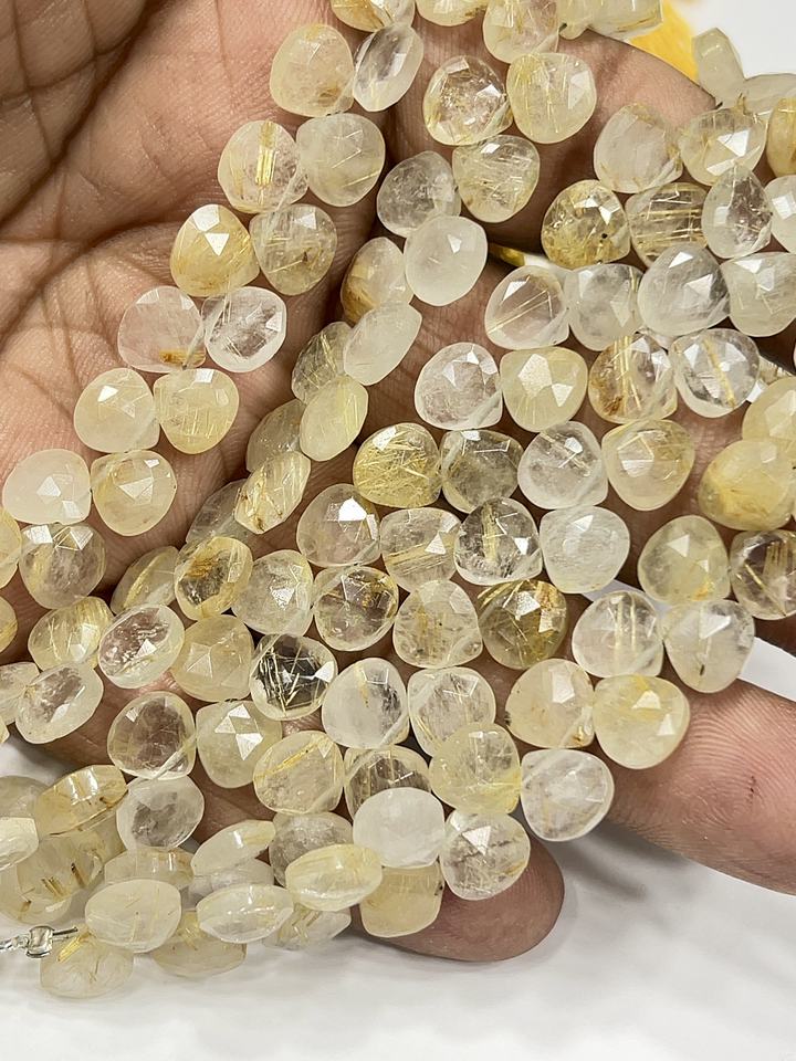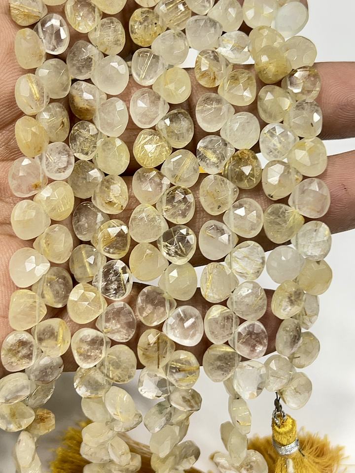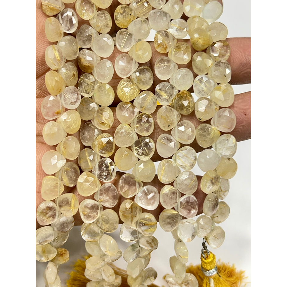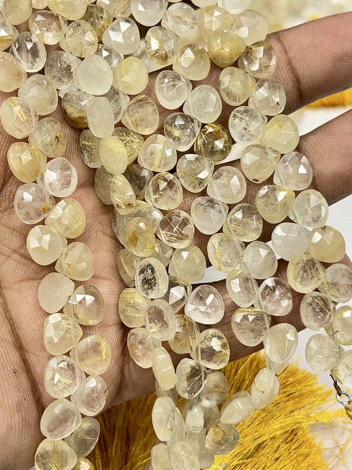 ลูกปัดควอตซ์รูทิเลตสีทองธรรมชาติทรงหัวใจเจียระไน ขนาดประมาณ 6-7 มม. เส้นใยขนาด 8 นิ้ว